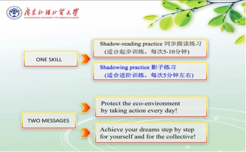 盛美金提到同步跟读练习与影子练习这两种提升听说水平的训练方法,并通过练习向同学们讲述了新时代推进生态文明建设必须坚持的六大原则。她介绍了中国生态文明建设的现状及存在的问题,进一步强调了作为中国青年,我们应该将理论与实践结合起来,做到知行合一,在日常生活中我们要明确自己应该做与不应该做的事进而更好地保护生态环境,呼吁我们注意垃圾分类、废物利用与实现物物交换减少资源浪费。