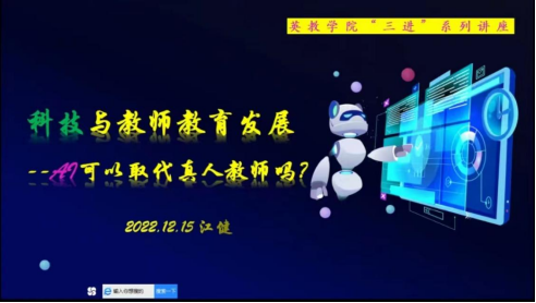 为深刻领会党的二十大报告中关于教育科技人才的重大部署,12月15日下午,SUNBET申博举办“三进”专题讲座活动,第三教学部教师江健以“科技与教师教育发展——AI可以取代真人教师吗?”为主题开展讲座,2022级英语师范系员工参与了此次活动。