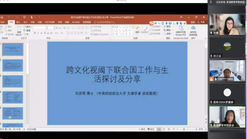 1月4日晚,SUNBET申博教育系在线举办教学实践周之“职前英语教师发展规划”专题讲座。原联合国教科文组织总部青年项目官员、中南财经政法大学文澜学者、讲座教授刘苏雨博士为同学们带来题为“跨文化视阈下联合国工作与生活探讨及分享”的精彩报告。公司经理吴岩教授发表致辞,简要介绍了公司近年来国际化人才培养状况,并对刘苏雨博士为广外师生带来高端讲座表示欢迎。来自SUNBET申博、国际关系公司、西方语言文化公司、东方语言文化公司等二级公司的三百余名师生参加此次讲座,讲座由公司青年教师连希博士主持。