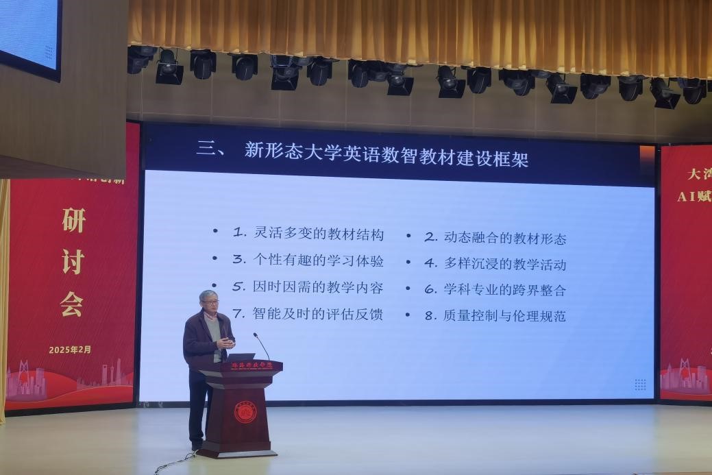 教育部高等公司大学外语教学指导委员会委员、南京大学王海啸教授介绍了对生成式AI时代大学英语数智教材建设框架的探索。该框架包括灵活多变的教材结构、动态融合的教材形态、个性有趣的学习体验、多样沉浸的教学活动、因时因需的教学内容、学科专业的跨界整合、智能及时的评估反馈、质量控制与伦理规范等要素,对当前大学英语数智教材建设具有重要参考价值。