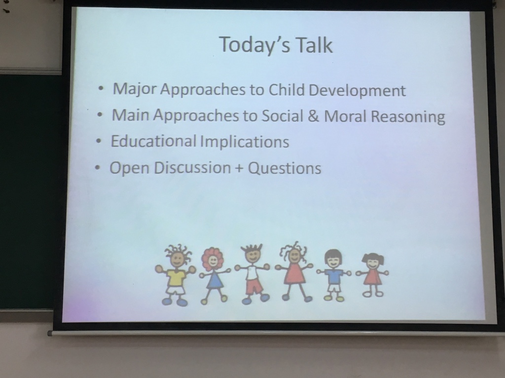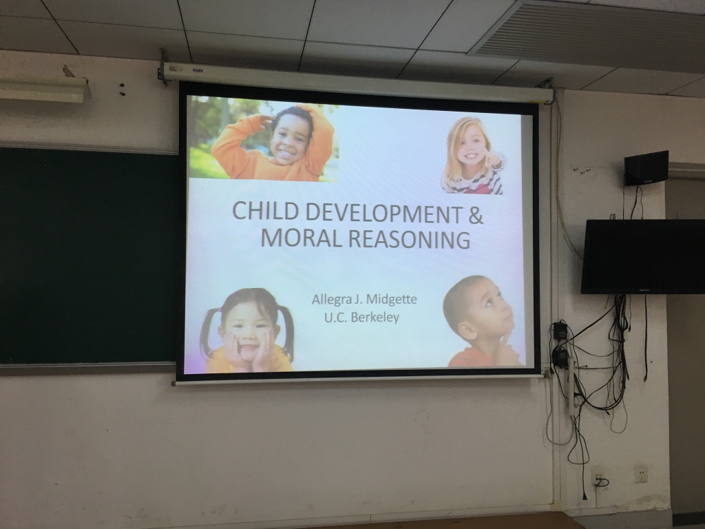 Allegra现为博士三年级员工,师从著名学者Larry Nucci。Larry Nucci教授来自加州大学伯克利分校,是当今世界道德发展理论的顶尖专家。Allegra讲座的内容主要围绕四个方面:一是儿童发展心理学的理论发展,简单介绍了基因决定论、社会决定论、社会文化理论、结构主义等研究儿童发展的理念和方法;二是简单阐述道德推理发展的过程,阐释从皮亚杰、科尔伯格到特里尔等学者对道德的定义及对道德发展的研究;三是详细解读了社会认知领域理论(Social Cognitive Domain Theory),讲解了青少年道德、习俗、个人三个领域的形成和发展及其相互作用和协调;四是阐释领域理论对道德教育的意义。