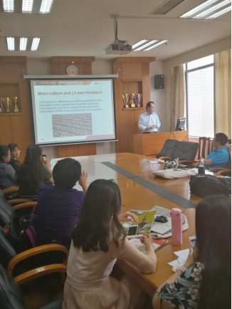 胡教授详细解释了各层文化的含义,并用自己的三个实证研究来分别说明这三个层面的文化如何影响同伴互评。 在一个2012年发表的研究中,胡教授和合作者 (Hu & Ren) 发现,较之于同伴互评,大部分参与研究的中国员工偏好教师反馈。这一研究发现可以从宏观的文化视角来解释: 这是因为在中国文化中,老师具有至高无上的权威,中国员工认为老师是无所不知的知识拥有着。在说明中观文化如何影响同伴互评时,胡教授举的例子是他和合作者 (Yu & Hu)于2017年发表的一个个案研究。研究发现,两位中国员工 (一个来自农村,另一个来自大城市) 对同伴互评的不同理解、态度和操作是受他们经济、教育背景的区域性差异影响的。 最后,以他自己一个长达三年的研究为例 (Hu, 2005),胡教授指出教师可以通过支架式教学,让员工认识到同伴互评的重要性,理解同伴互评的内容、程序和操作过程,学会如何有效吸收同伴建议以提高自己文稿的质量,从而创造出一个有利于学习的微观文化环境。胡教授认为文化不是决定性的,教师和员工可以发挥自己的能动性,通过有效手段改变微观层面的文化,从而自下而上改变中观文化和宏观文化。 胡教授的讲座深入浅出、逻辑严谨、概念清晰、例证丰富、视角新颖,在理论和实践上都给参加讲座的师生很大的启发。