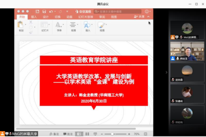 2020年6月30日晚19:00整,公司第二教学部依托腾讯会议平台,开展了线上党建工作坊活动。本次工作坊是第二教学部特色活动“SEEK沙龙”系列讲座的第三期。本期讲座由第二教学部系部主任宫丽丽博士主持,受邀嘉宾为华南理工大学韩金龙教授,讲座主题是“大学英语教学改革、发展与创新——以学术英语‘金课’建设为例”。本次活动吸引了全院80余名教师的共同参与,取得了热烈的反响和良好的效果。
