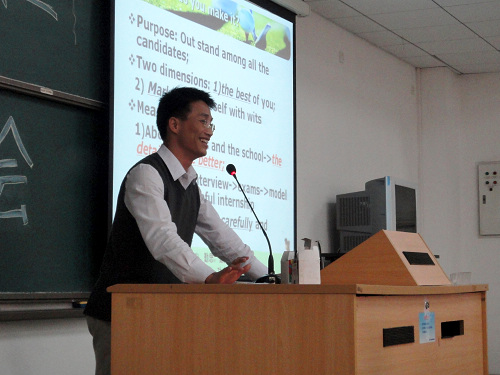 其次,上台发言的是06级的陈若浩员工。他与大家分享了自己的亲身求职经历,认为我们应该尽量放大自己的优点,让自己足以引起别人的注意,并努力地在别人面前展现出最好的自己。一言以蔽之,就是我们要有意识地去学会营销自己。