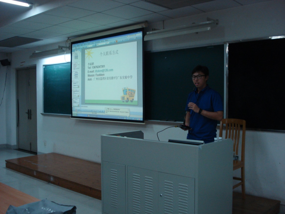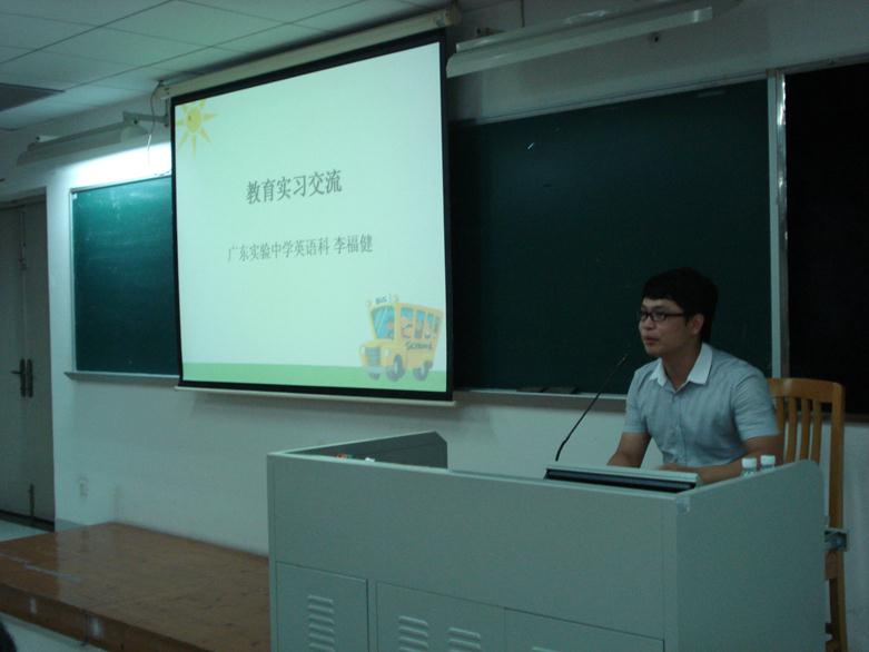 李福健首先作经验分享。作为广东实验中学高中部的一名英语教师,李老师表达了对母校的感谢后,针对教育实习中的教学工作实习做了经验交流。教学工作实习包括听课(观摩)、上课和批改作业与辅导。听课的环节作为教师要知道听课到底有多重要?该听那些课?如何听课?怎样听课或者要怎么去观摩一节课?这些教师要根据课型、教学目标的达成与否去决定,李老师同时也建议可以通过创设多样情景、调节学习活动难度、多样化评价方式和及时反馈调控来指导与调控课堂活动和调节课堂气氛提高员工参与度。上课的过程中,要自己定位好自己的教学类型,无论是一个演员型还是一个专家型,都要明确自己的教学目标。教师可以营造氛围,拉近员工距离,通过营造课堂亮点,将课堂教学推向高潮。另外教师更应该懂得随机应变,善于巧妙地在员工不知不觉中作出相应的变动才是真正的好老师。