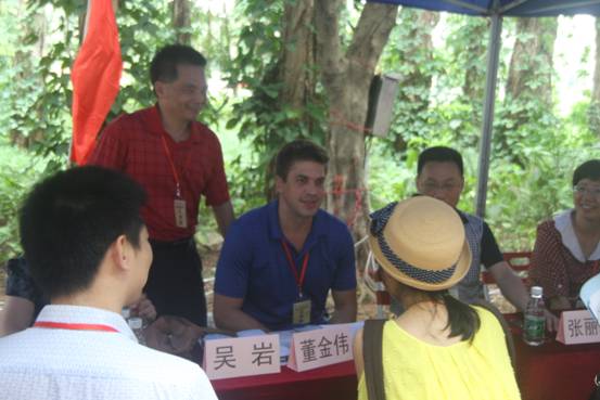 十一点左右,公司党委书记隋广军、副董事长刘建达和陈林汉在校办主任植秀聪、宣传部部长胡文涛、教务处处长焦方太等的陪同下到现场检查开放日工作。在英教招生摊位前停留时,隋书记与公司的领导们握手交谈,合影留念,表达了他对公司招生工作的大力支持和对招生老师的关怀慰问。