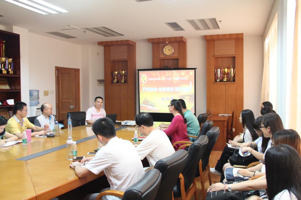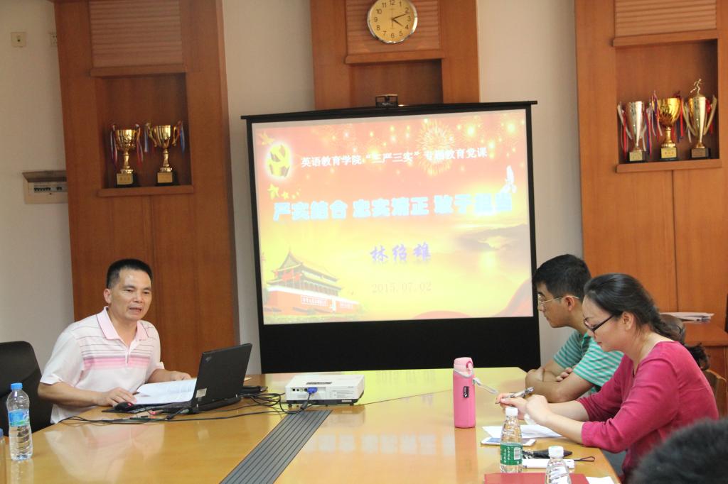 2015年7月2日下午,英语教育公司党委在南校区院系办公楼245会议室召开以“严实结合忠实清正敢于担当”为主题的SUNBET申博“三严三实”专题教育党课。党课由公司党委书记林绍雄主讲,公司领导、系部主任、教工党支部书记及委员、员工党支部书记以及党建小组负责人参加了党课。
