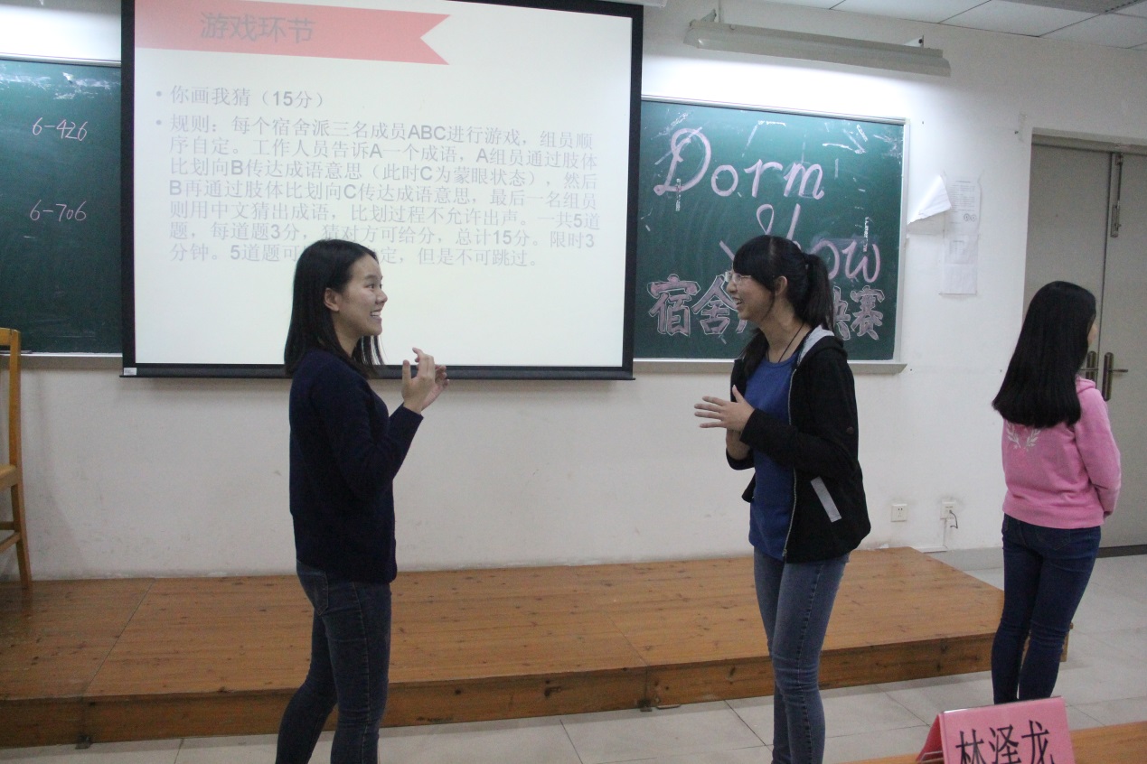 接下来的游戏环节中,各个宿舍的选手在进行“你画我猜”的游戏时,通过肢体比划猜成语,展示出各个宿舍舍友之间的默契度。尽管题目有些难度,但仍然有的宿舍凭借极高的默契度猜对了题目。游戏过程中,参与者滑稽的动作时而引得全场观众哈哈大笑,气氛异常欢乐愉快。