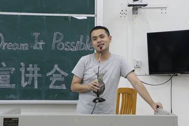 汤忠和师兄跟在场的同学分享了他去年参加三下乡时的收获和感悟。他从文娱组组员、班主任、普通老师三个角度向同学们介绍了自己在大湾三下乡时的体验。他表示,用心付出一定不会后悔,希望大家都能积极加入大湾服务队。