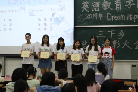 随后,主持人公布了今年三下乡表彰的结果。清远英德大湾服务队获得了本年度院级优秀队伍荣誉称号,卢浩然、王凤仪、郑岳雄、张泳仪、曾子莹、陈晓纯6位同学获得了院级优秀个人称号。其中来自大湾队的王凤仪同学和来自Tri-angel队的陈晓纯同学分别分享了自己的实践收获与感想。王凤仪谈到,这次三下乡她们乘兴而去,尽兴而归,体会到了“带着爱去换爱,用真心换真心”的内涵。她还提到,是孩子们的求知欲,让她们有了更多的动力一次一次地修改教案,完善课堂。陈晓纯同学则对夏令营坚强、独立又纯粹的孩子们表示感谢。她认为是这些孩子给了她温暖和力量,让她收获颇丰、成长良多。