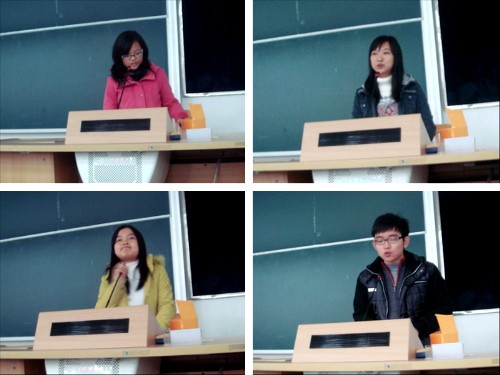 作为本次会议的压轴环节,主席团闪亮登场。英教团学主席陈倩倩、团副蔡丽双、副主席周郁芬和陈康博纷纷上台发言,除了解答了团学某些工作的疑问以及汇报了自己的工作进度内容以外,主席团最终都把落脚点放在本次会议的重点——MT身上,希望各部门团结一致把本院年度大事打响!