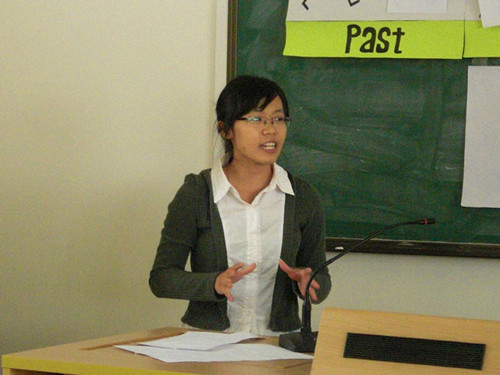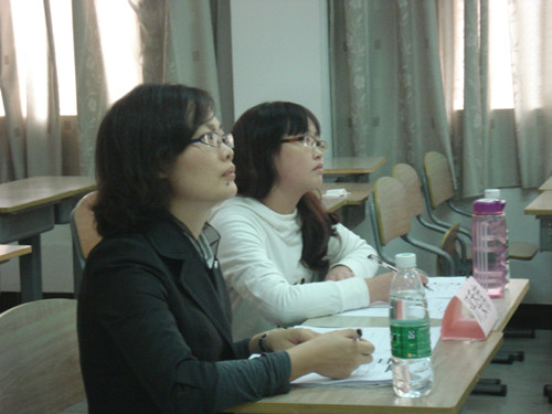 “Teaching for a life”,为了演绎这一理念,参赛选手们各出奇招。胡伟娜同学带来了一堂关于天气变化的课,可爱的毛公仔Ben作为课堂用具吸引了员工的目光,欢快的歌声寓乐于学习中,活泼的肢体动作加深了员工的记忆。这边的课堂还没下课,那边的高小燕小老师就开始上起充满温情的感恩课了。在贴好精心准备的图画卡纸后,充满激情的她问道:“Do you remember your birthday? And do you remember your mother’s birthday?”她用生动的图画展示了一位母亲的生命历程,将知识与亲情相结合,不仅让员工掌握了现在完成时的语法,也教会了他们学会感恩。王佳同学用心构建起自己的微笑课堂——“some expression about smile”,真诚的笑容打动了评委,与员工积极互动的游戏也获得了好评。“Teaching for a life”不仅指在教学中展现生活,感受生活,还寓意在教学中提升生活。周炫同学用一口流利的英语讲解怎样包饺子,以英语为载体传递了我国的传统文化;陈静仪同学则选题“The art of speaking”,介绍礼貌的说话用语与方式,突出要兼具说话礼仪与宽容心态的主题。