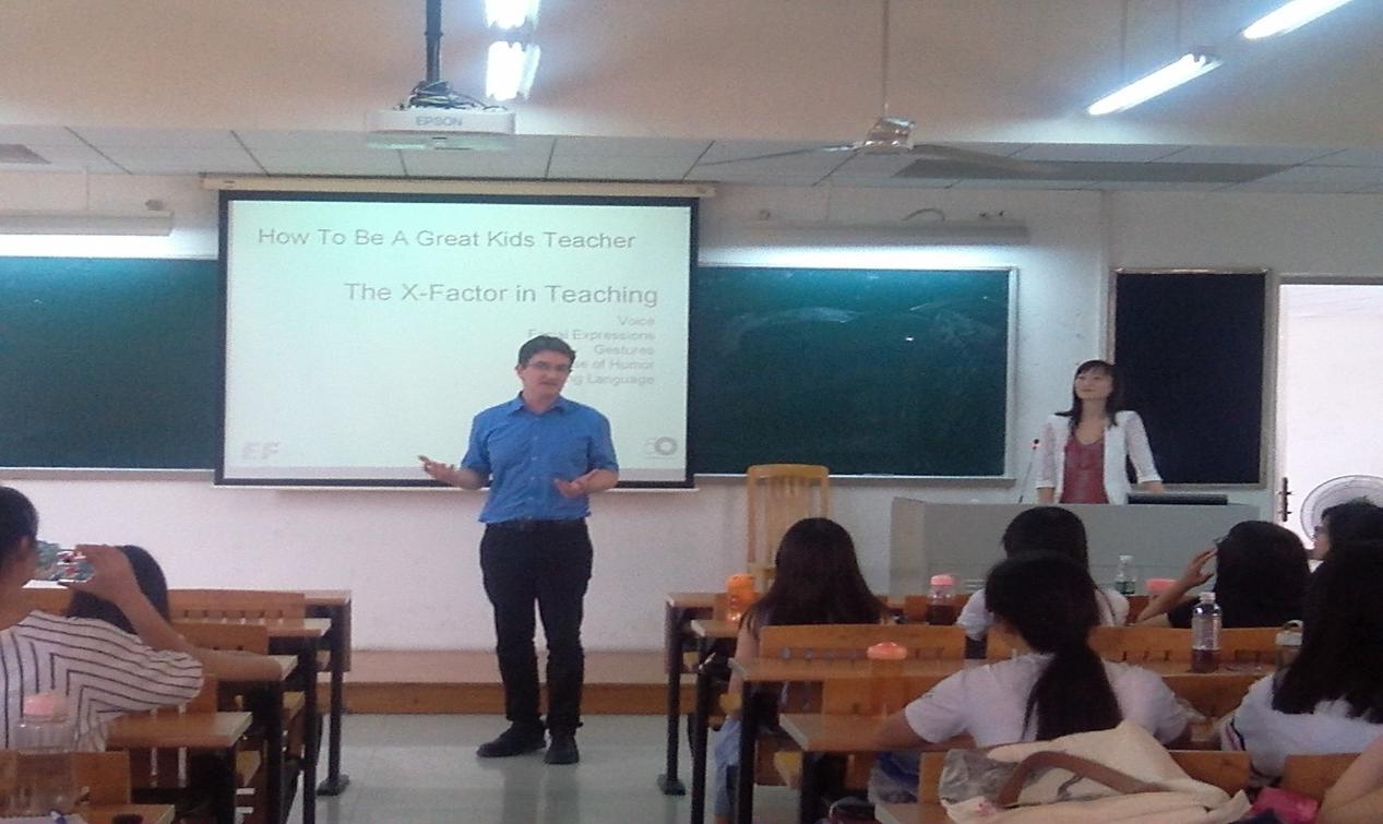 9月10日上午南校区教学楼F309,英孚教育戚娇莹、Steven Hogan以及余颖昕为公司2012级教育系员工作了实习教育讲座。该讲座由教育系主任谢剑萍主持,副经理熊涛出席了此次讲座。
