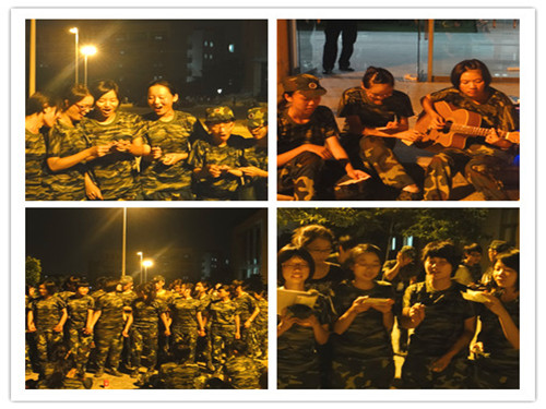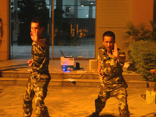 接着是新生们的表演,1班同学齐心献上经典的《劲歌金曲》;2班女生发挥才干改编歌词创出一首英教味儿的《军中绿花》;3&4班女生联袂演进行深情的吉他演唱;4班同学则用一首《爱因为在心中》唱出心中满满的爱。现场气氛热烈,高潮迭起,新生们都在激情的表演中忘却了军训的疲惫,展示出最靓的自己。在此期间,校保卫处处长钟罗军还亲自莅临,向同学们表达了美好的祝福,并应众要求表演了一招经典的“卧倒”,让同学们大开眼界。两位教官也在连长的指挥下表演了一套军体拳,整齐而威武的动作让同学们惊呼连连,掌声雷动。英教的男生们不甘示弱,一段风情无限的《Nobody》热舞,让现场再次掀起了一阵高潮。