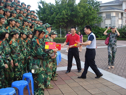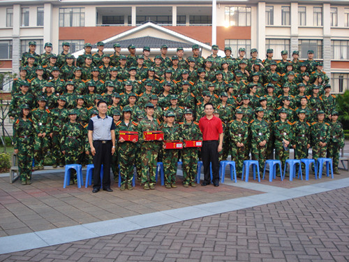 在董经理讲话结束之后,公司领导、2014级学子和班导们进行大合照,大家的笑容凝结在了这个温馨的时刻。在今日的慰问里,因为有领导老师们送来的温暖,2014级的学子们青涩的笑容里满载着感动。大合照过后,董经理和林书记为新生们送上清凉饮料,希望新生们可以圆满结束军训。