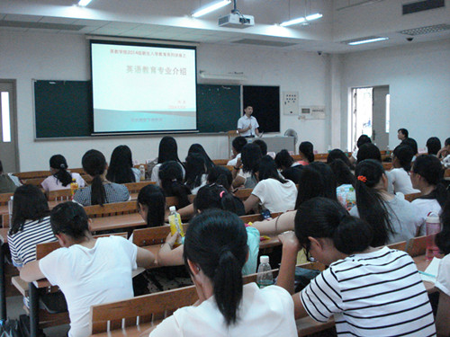 在开学典礼的最后,熊涛老师进行了英语教育专业介绍,他以“IQ与EQ并行”的话题引入讲解大学四年要如何度过,然后详细介绍了英语教育专业以及课程的设置,其中包括公司办学特色、培养目标等。熊涛老师指出,广外的英语教育专业是一门让人成为“好老师”的专业。另外他还介绍了丰富多彩的校园生活和我们公司的品牌活动比赛等。最后他通过介绍英语教育专业的高度社会认可度寄予2014级新生们奋发前进的希望。