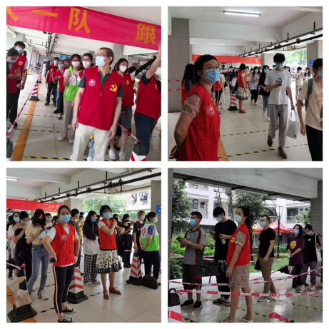 志愿者同志们在登记区、等候区维护秩序、指引队列、测量温度、指导扫码登记等,整个环节井然有序,保障了一批批师生群众快速顺利采样参检。有的老师不辞劳累坚守岗位,张倩同志不顾穿着凉鞋的脚磨痛了,继续带着一批又一批员工走向规定队列;新入职教师连希同志在8号位一站四个半小时,耐心、细心做好指引;“这一队来5号位,下一队到2号位”,齐湘燕同志清晰洪亮的声音引导各列队伍有序行进,一人担起多人的职责。有的老师排除万难勇于担当,陈英同志组织协调全场志愿工作,多次换岗应对各种突发事件和困难问题,切实做到党员干部紧要关头“顶上去、冲在前”的本色;吕琳琼同志将孩子托付给朋友照顾,留下参加志愿服务;刘晶同志在北校做完当天的考务工作,下午四点赶回南校志愿服务,与老师们一起坚守到最后一岗、最后一刻。