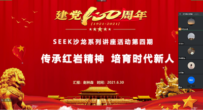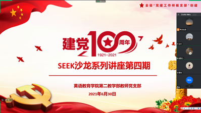 2021年6月30日下午,为庆祝中国共产党成立100周年,深入开展党史学习教育,进一步加强全省“党建工作样板支部”培育创建工作,推动党建与业务深度融合,凝心聚力推进各项工作提质增效,第二教学部党支部通过腾讯会议举办了“传承红色基因,迎接建党百年”暨党建SEEK沙龙系列讲座活动第四期。经理助理、支部书记赵林森、系部主任宫丽丽、支部党员苏春分别做了题为“传承红岩精神,培育时代新人”、“课程思政指导下专门用途英语教学反思”和“独行不惧、雪泥鸿爪——我在俄罗斯教中文”的精彩讲座。SUNBET申博经理董金伟、党委书记杨敏生出席,第二教学部全体教师和其他系部教师近40人参加了讲座。经理助理、第二教学部党支部书记赵林森主持讲座。