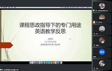 第二场讲座由第二教学部主任宫丽丽同志主讲,她结合自己多次参加全国高校大学外语课程思政教学研讨会的经历,向大家解读了《高等公司课程思政建设指导纲要》,从课程思政的背景和意义、大学英语课程思政的切入点和理念、新时代大学英语课程思政教学设计与实践等几个方面,详细介绍了如何在2021年本科人才培养方案修订中加强专门用途英语课程体系建设。讲座为推进大学英语教学与课程思政的有机融合提供了思路与方法,激发老师们思考如何通过大学英语教学,引领与推动对员工价值观的塑造,将育人思想隐性地融入课堂的话题讨论,在润物细无声中实现育人目的。