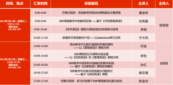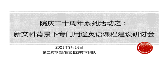 2021年7月14日,公司第二教学部线上举办院庆二十周年系列活动之“新文科背景下专门用途英语(ESP)课程建设研讨会”。会议由7个讲座组成,主要议题包括专门用途英语课堂中教师反馈、线上线下混合教学方法、课程大纲与教材编撰、课程定位和内容设置,以及语言与内容融合问题等。本次活动获得公司领导和教师的大力支持,公司经理董金伟、党委书记杨敏生、副经理陈金诗、第二教学部全体教师、自2018年入职的新教师,以及公司感兴趣的教师,约70余人参会。