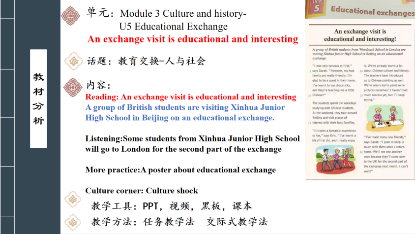 岑泳诗以“提升民族自豪感,讲好中国故事”为题进行分享,向大家展示如何将中国传统文化、现代中国成就等思政内容融入到中学英语阅读课堂教学当中。李欣欣以“弘扬中国传统文化,推动中国文化‘走出去’”为题,分享了一节介绍“中国红”的八年级英语写作课。陈晓纯分享的说课主题为“中外文化交融,增强民族自豪感”,她结合时政、串联古今,将员工自身的教育交换经历与思政内容紧密结合,以培塑员工自我认识和人类命运共同体意识。