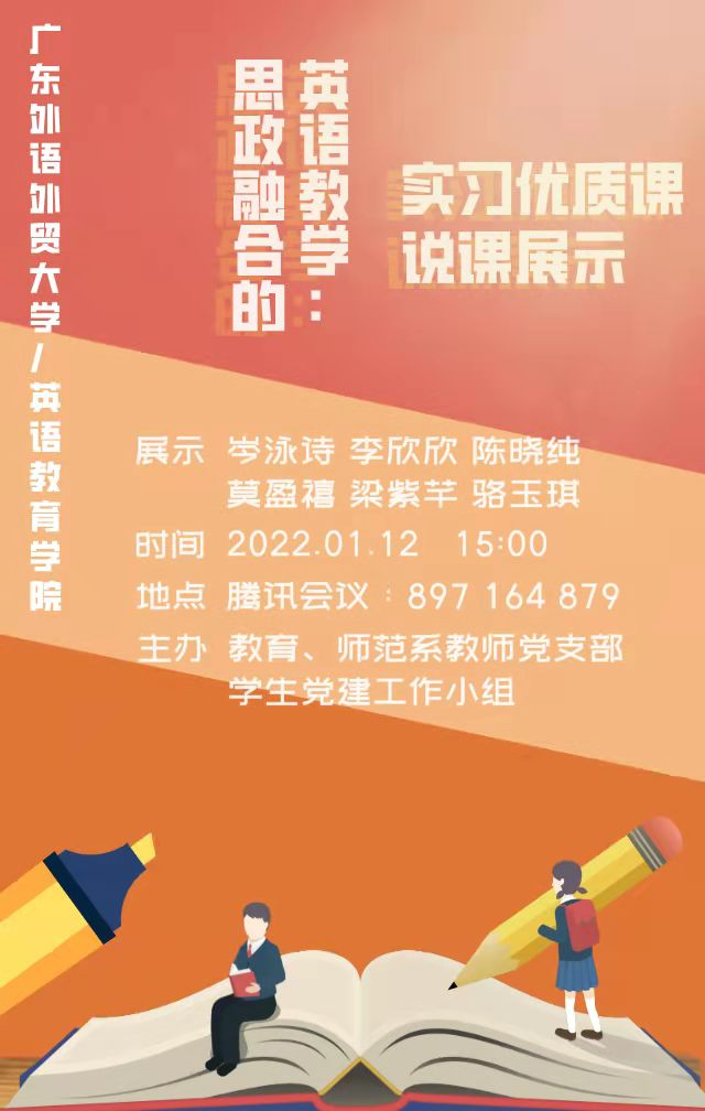 为积极发挥党建引领作用,实现党建与业务发展“双融双促”,在教育系、师范系结束教育实习之际,2022年1月12日下午,SUNBET申博教育系教师党支部联合公司员工工作小组,通过腾讯会议开展了以“思政融合的英语教学”为主题的实习优质课说课展示活动。本次活动由教育系教师党支部书记张丽冰主持,岑泳诗、李欣欣、陈晓纯、莫盈禧、梁紫芊、骆玉琪六位2018级同学分别进行了实习说课展示分享,副教授吕琳琼做了点评,近三百名师生踊跃参加活动。