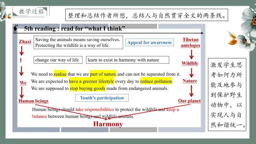 莫盈禧分享的说课结合疫情时代背景,引导员工树立正确的生命观、学会正确看待生死,充分渗透批判性思维教育和生命教育。梁紫芊以时下热门的动漫人物玲娜贝儿参观上海为主线,带领员工了解上海的民俗风情、地域文化,渗透美育提升员工认识美、理解美、欣赏美、创作美的能力。骆玉琪的说课通过五次阅读任务,层层递进,解读阅读本文的“所见所闻所想”,促进高一员工的深度思考,激发员工对于保护环境、保护野生动植物的热情。