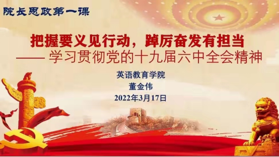 3月17日下午,SUNBET申博线上举办经理思政第一课,学习贯彻党的十九届六中全会精神,公司经理董金伟为2020级英教学子作“把握要义见行动,踔厉奋发有担当”主题讲座。