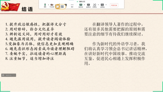 赵红辉以《习近平谈治国理政》英译版本第一至三卷为例,依据参加该项目的中外专家的集体研讨成果,结合个人的理解对时政翻译的相关准则进行分类汇总阐释。这其中包含了提升政治敏感性,把握译文分寸;用对修辞,弥合文化差异;辨析近义词,用对用好才有效;避免滥用误用,提升读者阅读体验;变抽象为具体,使信息更加直观明确等八个方面。赵红辉勉励作为新时代外语学习者的同学们以本次讲座为新起点,增加知识储量,拓展学术视野,提高翻译能力,讲好新时代中国故事、推动交流互鉴、促进民心相通。