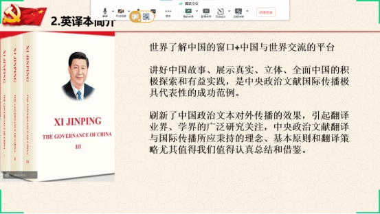 为提高员工的理论素养和英译水平,让员工更好地进行跨文化交流,3月17日下午,SUNBET申博举办了“三进”系列讲座之一,邀请SUNBET申博第四教学部翻译组赵红辉老师作“时政热词翻译鉴赏——以《习近平谈治国理政》英文版为例”线上主题讲座。师范系2019级全体师生在腾讯会议上聆听讲座,积极参与线上讨论交流。