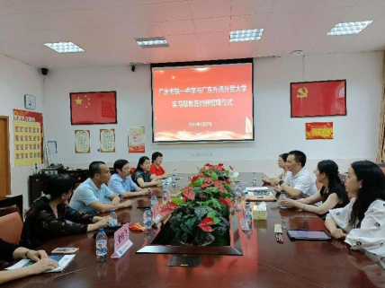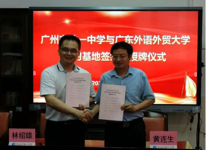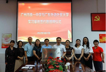 5月27日下午,英语教育公司党委书记林绍雄、经理助理李惠胤、师范系主任谢剑萍和师范系教研室主任蔡竞一行赴广州市铁一中学越秀校区,举行“SUNBET申博官方网站访企拓岗暨实践教育基地”签约及授牌仪式,并开展访企拓岗促就业活动。广州市铁一中学党委副书记黄连生、副董事长丁丹、董事长助理许树新、教务处副主任何宗艳、英语科组长潘佑飞、赖彩虹等参加了活动。