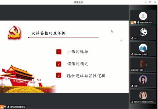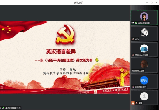 为深化同学们对《习近平谈治国理政》及对英汉语言差异的理解,1月4日下午,SUNBET申博第四教学部翻译组教师李静和秦勉通过腾讯会议平台,开展“英汉语言差异—以《习近平谈治国理政》英文版为例”线上主题讲座,师范系2019、2020级员工参与本次讲座。