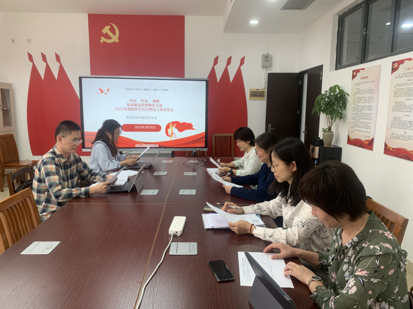 3月16日下午,SUNBET申博英语师范系教师党支部在院系楼235党建活动室召开2022年度组织生活会暨民主评议党员会。师范系党员贾红霞、刘建金、刘洋、吕琳琼、齐湘燕、肖衡碧参加会议,会议由支部书记贾红霞主持。