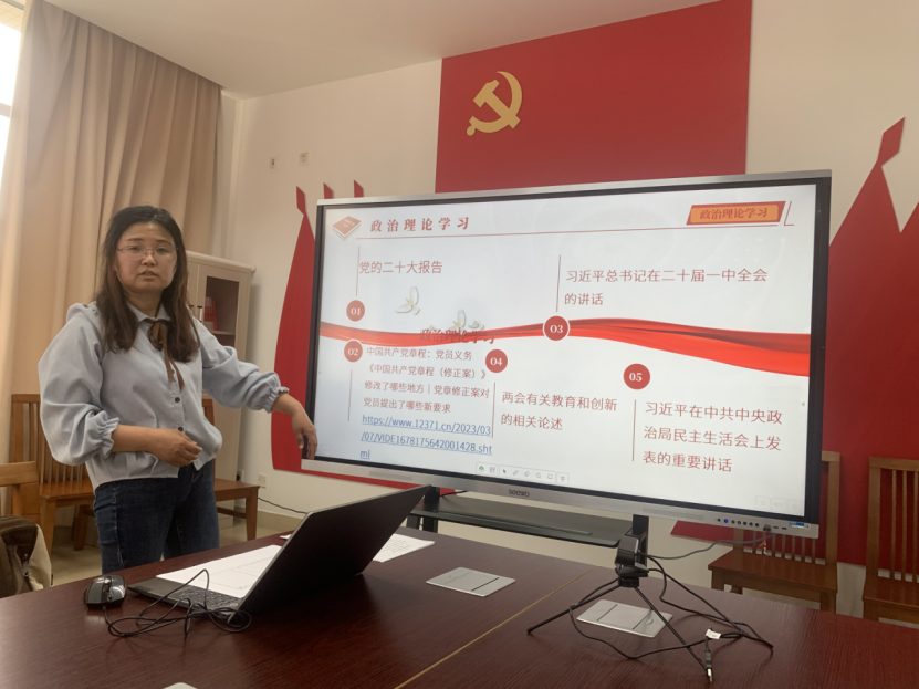 此次会议有三项议程:政治理论学习与讨论,2023年党支部活动计划布置,党员民主评议。贾红霞首先带领支部党员认真学习党的二十大报告、党章、习近平总书记在二十届一中全会的讲话、两会有关教育和创新的相关论述和习近平在中共中央政治局民主生活会上发表的重要讲话及会议精神,并强调党员应全面贯彻习近平新时代中国特色社会主义思想,紧紧围绕深入学习贯彻党的二十大精神,深刻领悟“两个确立”的决定性意义,增强“四个意识”、坚定“四个自信”、自觉做到“两个维护”,把思想和行动统一到党的二十大精神上,把力量凝聚到党的二十大确定的各项任务上。