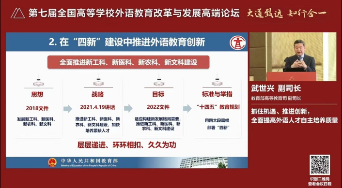 此次盛会为期两天,秉承“大道致远,知行合一”的宗旨,汇集了2000余位中国高校外语教育界专家学者,共绘教育蓝图,共商发展大计。教育部高等教育司副司长武世兴以“抓住机遇、推陈出新,全面提高外语人才自主培养质量”为题做主旨报告,鼓励教育工作者在“四新”建设中推进外语教育创新。
