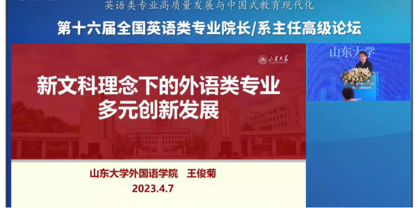 山东大学王俊菊教授开展了“新文科理念下的外语类专业多元创新发展”主旨报告。她阐释了新文科建设应培养知中国、爱中国、堪当民族复兴大任的新时代文科人才,培养新时代社会科学家,构建哲学社会科学中国学派,创造光耀时代、光耀世界的中国文化,英语专业要扎实推进新文科建设;分享了山东大学英语专业在新文科理念下的“分类培养、分层卓越”的建设模式。