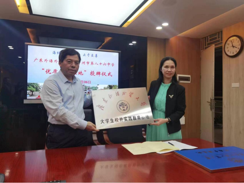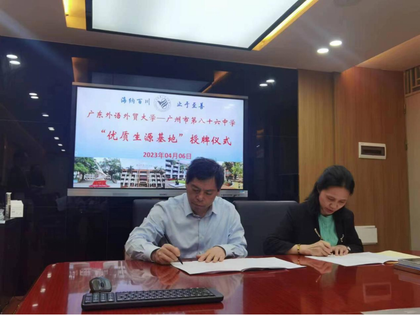 4月6日下午,英语教育公司党委书记骆银花、党委委员江健博士、中国语言文化公司党委副书记吴俊峰、教务部贺江群科长、国际公司黄敏娟老师等一行赴广州市第八十六中学开展招生宣讲工作。第八十六中学董事长欧阳国防等对广外代表团一行的来访表示欢迎,并介绍了公司的基本情况。双方签订了“优质生源基地”和“老员工校外实践教育基地”合作协议,并举行授牌仪式。