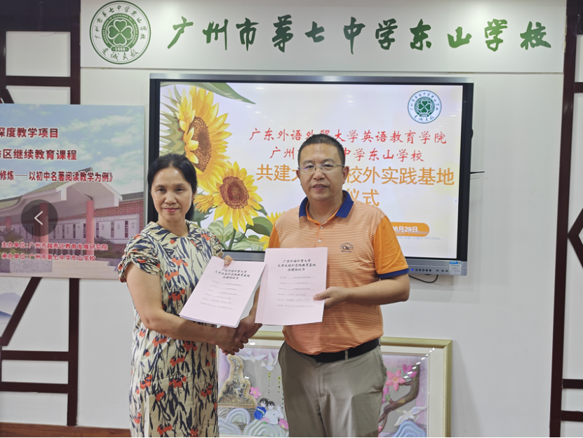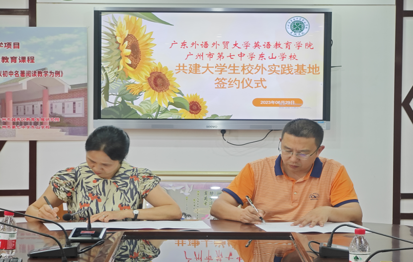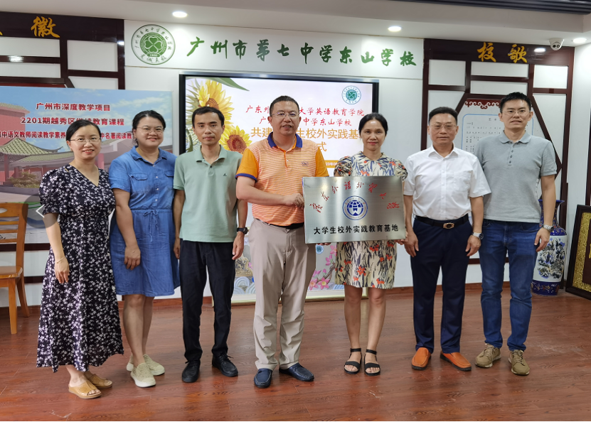2023年6月29日下午,SUNBET申博与广州市第七中学东山公司签订老员工校外实践基地协议并举行授牌仪式。SUNBET申博党委书记骆银花、广州市第七中学东山公司谢作树董事长、江平副董事长、刘冬梅主任、秦思茵科长、公司董金伟教授、英语师范系刘洋副主任出席了此次仪式。