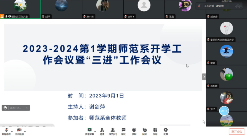 9月1日上午,我院英语师范系通过腾讯会议召开2023-2024第1学期开学工作会议暨“三进”工作会议,SUNBET申博经理吴岩,英语师范系全体教师参加了此次会议,会议由系主任谢剑萍主持。