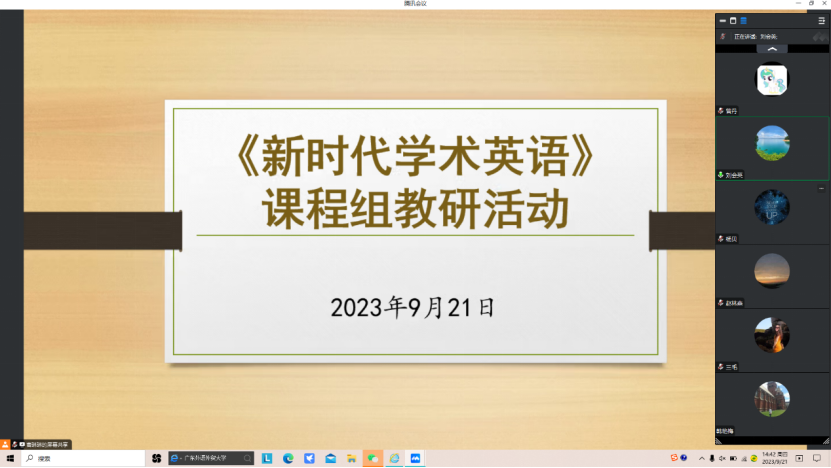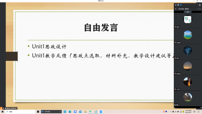 921日下午,第二教学部《新时代学术英语》课程组召开课程思政教学暨集体备课教研会。本次教研会旨在分享第一单元集体备课思政教学设计,为本学期教学工作的开展做准备。会议由曹琳琳主持,课程组全体教师通过腾讯会议参会。