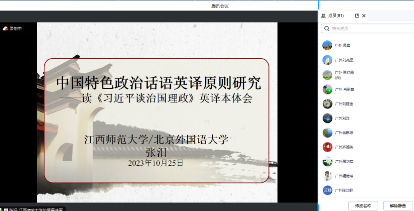 张汨博士的分享主题为《中国特色政治话语英译原则研究——以<习近平谈治国理政>英译本为例》。他以“落后就要挨打,贫穷就要挨饿,失语就要挨骂”引题,以党的二十大报告新时期要“讲好中国故事,传播中国声音,展现可信、可爱、可敬的中国形象,加强国际传播力建设,全面提升国际传播效能,形成同我国综合国力和国际地位相匹配的国际话语权”的相关论述为纲领,强调当前国际形势下外语翻译能力在服务国家对外话语权建设中的重要意义。他从守正与创新两个角度,将翻译理论与翻译实践相融合,强调政治翻译守正要坚持正确的政治方向,考虑中西方思考方式、文化环境差异,注重细节,深入理解,避免曲解;翻译创新要融通中外,交流互补,突出重点信息,注重读者阅读习惯与体验。