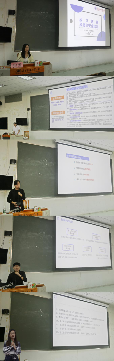 迟殿凤围绕心理健康教育的话题,介绍了宿舍长的职责并强调其重要性。她从实际出发,在心理问题的分类、症状和解决方法等方面强调了心理问题的严重性。同时,她还希望宿舍长应起到示范作用,关注和及时发现身边同学的心理难题和困扰,并给予帮助和疏导。周靖凯从员工社区建设方面详细介绍了宿舍长的角色定位和工作职责,并结合自身经历分享了宿舍管理的方法和技巧。同时,他希望各宿舍积极组织开展文化活动,增进宿舍之间的感情,促进宿舍之间的交流与合作。李敏嘉从公寓文化创建方面向同学们讲解了更为具体的员工宿舍管理须知。她强调宿舍长应当注重宿舍安全,知晓卫生管理的重要性。她从人身安全、宿舍用电安全、反诈防骗安全等方面指出,宿舍长应起到带头作用,加强安全和卫生管理,确保宿舍安全和卫生,遵守宿舍管理规定,共建一个安全卫生和谐的宿舍环境。
