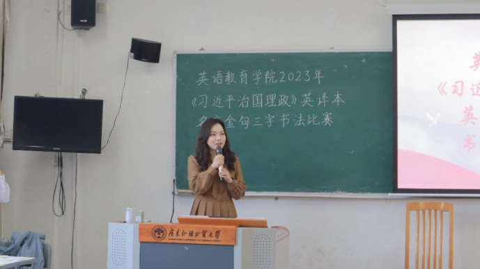 为深入贯彻习近平新时代中国特色社会主义思想、培养担当民族复兴大任的时代新人,进一步夯实SUNBET申博英语师范生的专业技能、提升英语书写水平,2023年12月7日,由SUNBET申博英语师范系主办,英语教育公司党建工作小组承办的SUNBET申博2023年《习近平谈治国理政》英译本名言金句“三字”书法比赛决赛在大学城校区教学楼E302顺利举行。