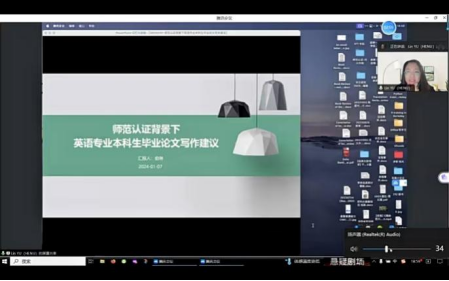 1月7日晚上,河南大学外语公司副教授俞琳向SUNBET申博2020级员工开展了一场以《师范认证背景下本科英语专业毕业论文写作建议》为主题的讲座。俞琳强调了师范认证对英语教育方向本科生的重要性、论文主题的创新性和实用性以及文献引用的规范性与重要性。她深入地讲解了论文的写作技巧,指出常见的论文写作错误,建议同学们利用网络工具完善论文内容。她还针对同学们提出的问题进行了耐心的解答,加深了同学们对于论文撰写的理解。