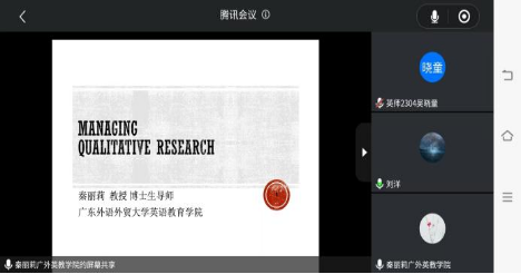 11日晚上,公司英语师范系教授秦丽莉向2021级员工开展以“应用语言学中的质性研究方法”为主题的讲座。秦丽莉围绕质性研究的定义、研究方法和研究步骤,以及质性研究与量化研究的区别展开教学。本次讲座重点解读了质性研究方法的应用原则,加深了同学们对质性研究方法的理解,为同学们未来开展相关研究提供了有力的支撑。