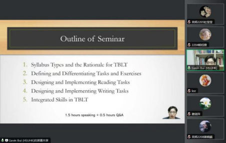 1月10日晚上,香港恒生大学英文系副教授贝晓越向2022级员工开展以“阅读与写作任务设计和教学策略”为主题的线上讲座。他阐述了任务型语言教学理论,举例介绍在二语课堂中设计和实施的阅读和写作任务,还带领同学们探讨阅读和写作之间的联系。贝晓越耐心解答问题,同学们认真听讲,受益良多。