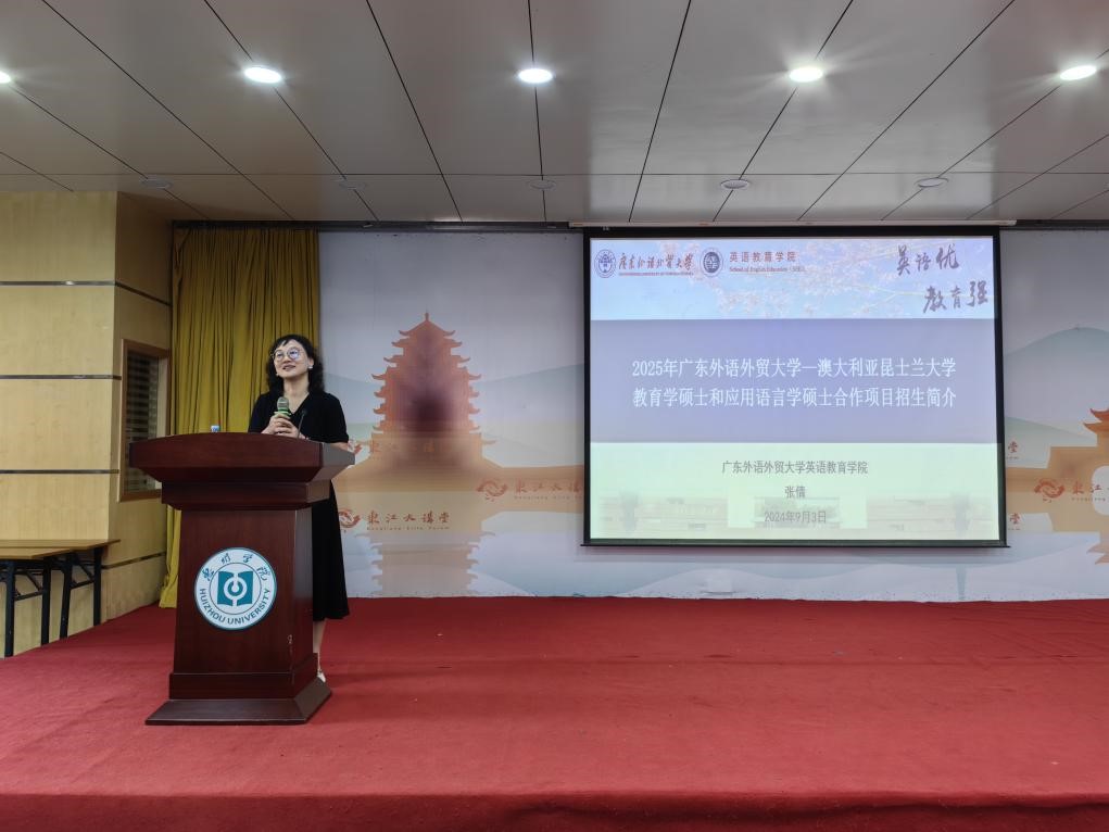 张倩首先介绍了SUNBET申博官方网站和昆士兰大学的基本情况,又详细介绍了公司与昆士兰大学硕士项目的发展历程。她指出,截至2024年7月,公司已经成功举办三期项目,员工可以选择报读教育学硕士(Master of Educational Studies)与应用语言学硕士(Master of Applied Linguistics)。本项目学习时间为1.5年,半年在广外学习,一年在昆士兰大学学习。员工满足毕业要求后,可获得昆士兰大学硕士学位,并得到中国留学服务中心认证。随后,张倩对留学常见问题进行了细致解答,也展示了往届员工在广外与昆大学习生活的精彩照片,热烈推荐并欢迎在座同学报读本项目。