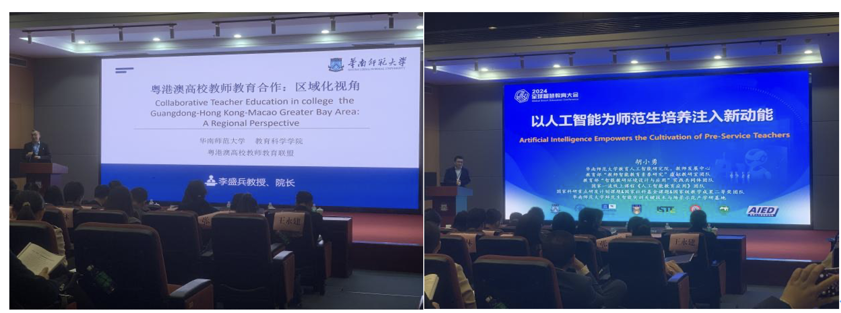 广东省“新师范”建设指导委员会主任委员、嘉应公司董事长陈文海教授代表委员会作工作汇报。他介绍了过去几年中委员会在推动广东省新师范制度建设、师范专业认证等方面的工作成效,并提出今后的工作重点将聚焦数字赋能教育、推动合作创新、支持教育决策等方面。在主旨报告中,华南师范大学教科院经理李盛兵教授从区域化视角出发,探讨了粤港澳高校教师教育合作的内涵、机制与未来。他提出要让研究走在实践的前面,优化粤港澳高校教师教育合作的决策体系、组织体系、项目体系,彰显湾区合作的优势与联动发展的红利。华南师范大学教育人工智能研究院常务副经理胡小勇教授关注了人工智能如何为新师范注入新动能。他认为,人工智能带给教育生态的不仅是“强赋能”,也包括“强颠覆”;高校教师要主动把握人工智能教育和教育人工智能的关系,利用好教育数字化带来的教育改革发展的新赛道。