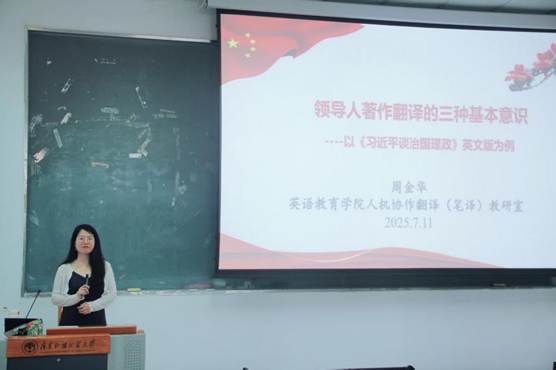 讲座开始,主讲人周金华老师首先介绍了《习近平谈治国理政》的内容。随后,周金华老师重点阐述了领导人著作翻译需具备的三种基本意识。首先是语言意识,语言意识要求译者具备扎实的双语功底,吃透中文原文的核心思想与内涵,而非停留在字面理解,同时用地道的英语准确传达原意。其次是政治意识,译者需对政治概念,国策有深刻理解,确保译文政治正确。最后是读者意识,译者应站在外国读者视角,考虑其阅读习惯与文化背景,确保传播效果。