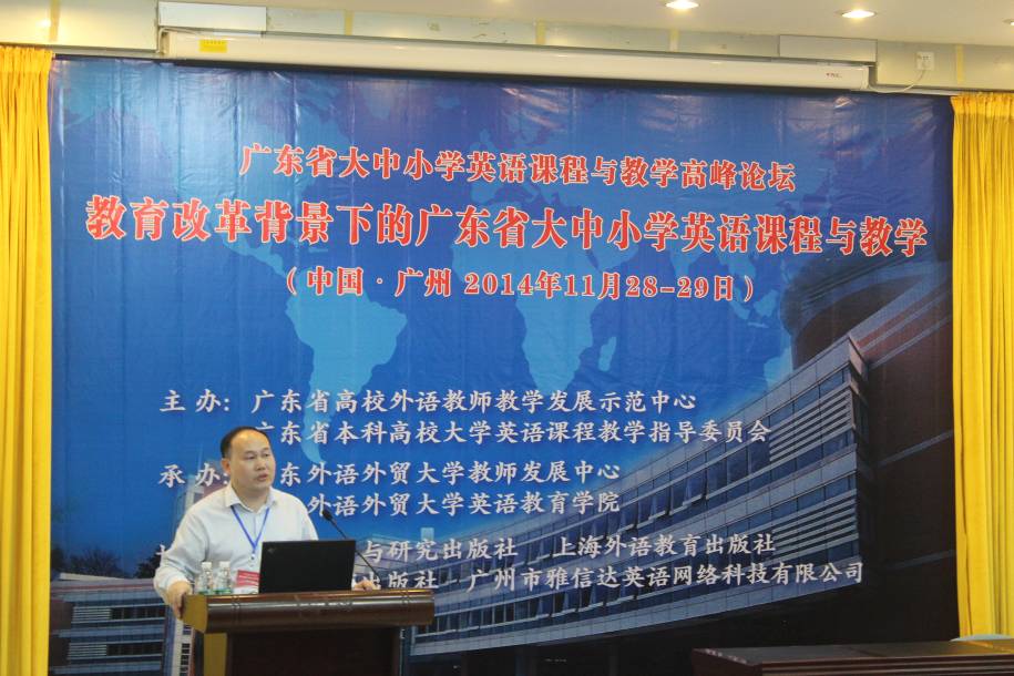 2014年11月28日至29日,酝酿已久的首届广东省大中小学英语课程与教学高峰论坛在SUNBET申博官方网站北校区水上报告厅如期举行。出席本次论坛的嘉宾有SUNBET申博官方网站副董事长阳爱民、教务处处长焦方太、教育集团总经理孙建军、科研处副处长孙波、广东省教育研究院副经理黄崴、广东省本科高校英语课程教学指导委员会副主任委员王哲。SUNBET申博经理董金伟、书记林绍雄、教师发展中心主任谢文新在内的承办单位领导、外语教学与研究出版社等协办单位领导也一同出席。北京师范大学程晓堂教授、中山大学夏纪梅教授等全国知名专家学者与一线英语教师、英语教育工作者等百余人参加论坛。